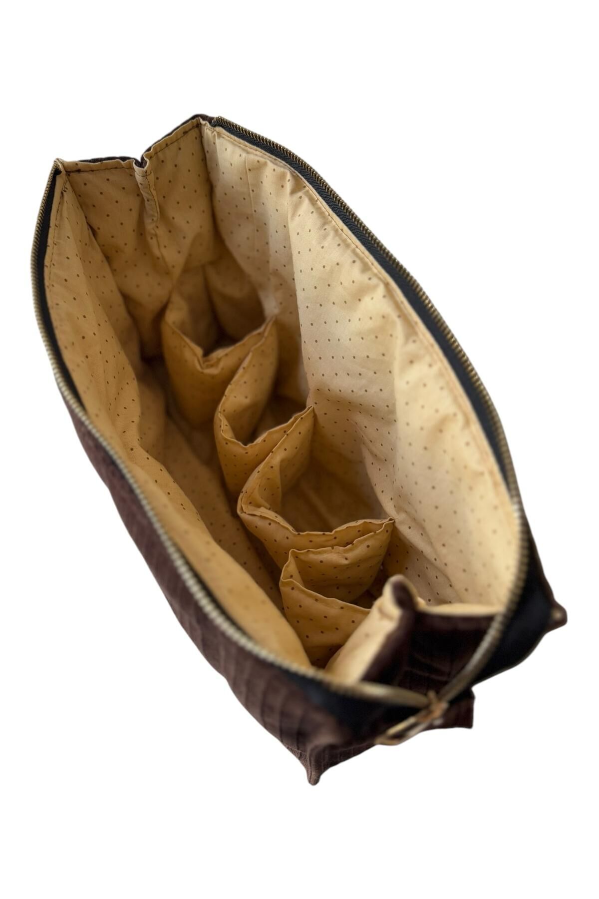 Kadife dokusu ve çok bölmeli iç tasarımıyla bu oragnizer çanta, eşyalarınızı düzenli ve ulaşılabilir tutmanız için ideal. Saç şekillendirici, makyaj ürünleri, bakım eşyalarına, dikiş malzemelerinden, hobi araçlarına kadar birçok farklı kullanım alanına uygundur. İç kısmındaki pamuklu, puantiyeli astarı hem şık hem de koruyucudur.