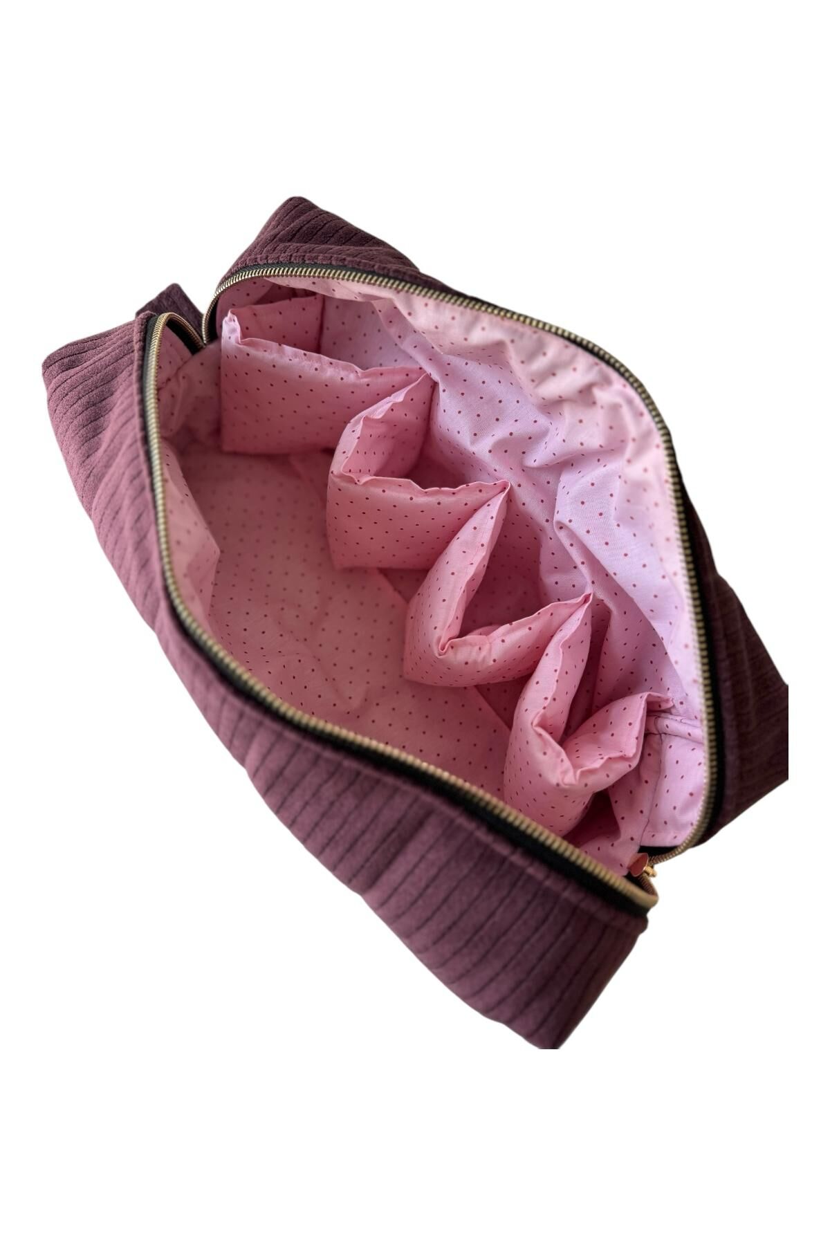 Kadife dokusu ve çok bölmeli iç tasarımıyla bu oragnizer çanta, eşyalarınızı düzenli ve ulaşılabilir tutmanız için ideal. Saç şekillendirici, makyaj ürünleri, bakım eşyalarına, dikiş malzemelerinden, hobi araçlarına kadar birçok farklı kullanım alanına uygundur. İç kısmındaki pamuklu, puantiyeli astarı hem şık hem de koruyucudur.