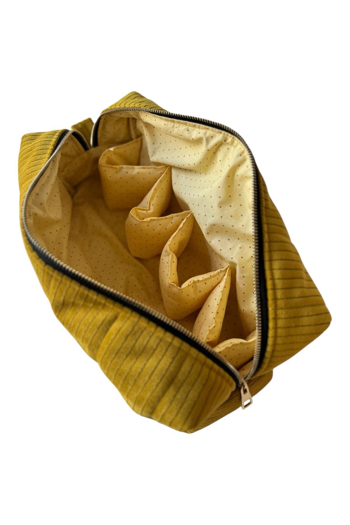 Kadife dokusu ve çok bölmeli iç tasarımıyla bu oragnizer çanta, eşyalarınızı düzenli ve ulaşılabilir tutmanız için ideal. Saç şekillendirici, makyaj ürünleri, bakım eşyalarına, dikiş malzemelerinden, hobi araçlarına kadar birçok farklı kullanım alanına uygundur. İç kısmındaki pamuklu, puantiyeli astarı hem şık hem de koruyucudur.