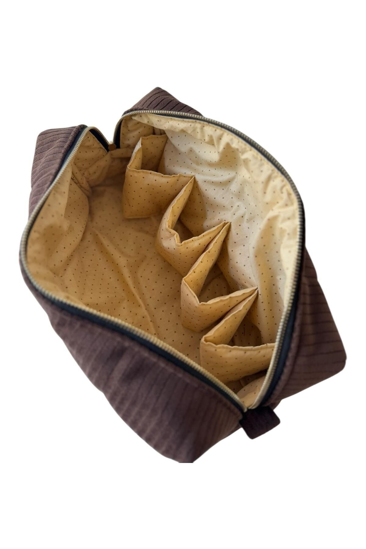 Kadife dokusu ve çok bölmeli iç tasarımıyla bu oragnizer çanta, eşyalarınızı düzenli ve ulaşılabilir tutmanız için ideal. Saç şekillendirici, makyaj ürünleri, bakım eşyalarına, dikiş malzemelerinden, hobi araçlarına kadar birçok farklı kullanım alanına uygundur. İç kısmındaki pamuklu, puantiyeli astarı hem şık hem de koruyucudur.