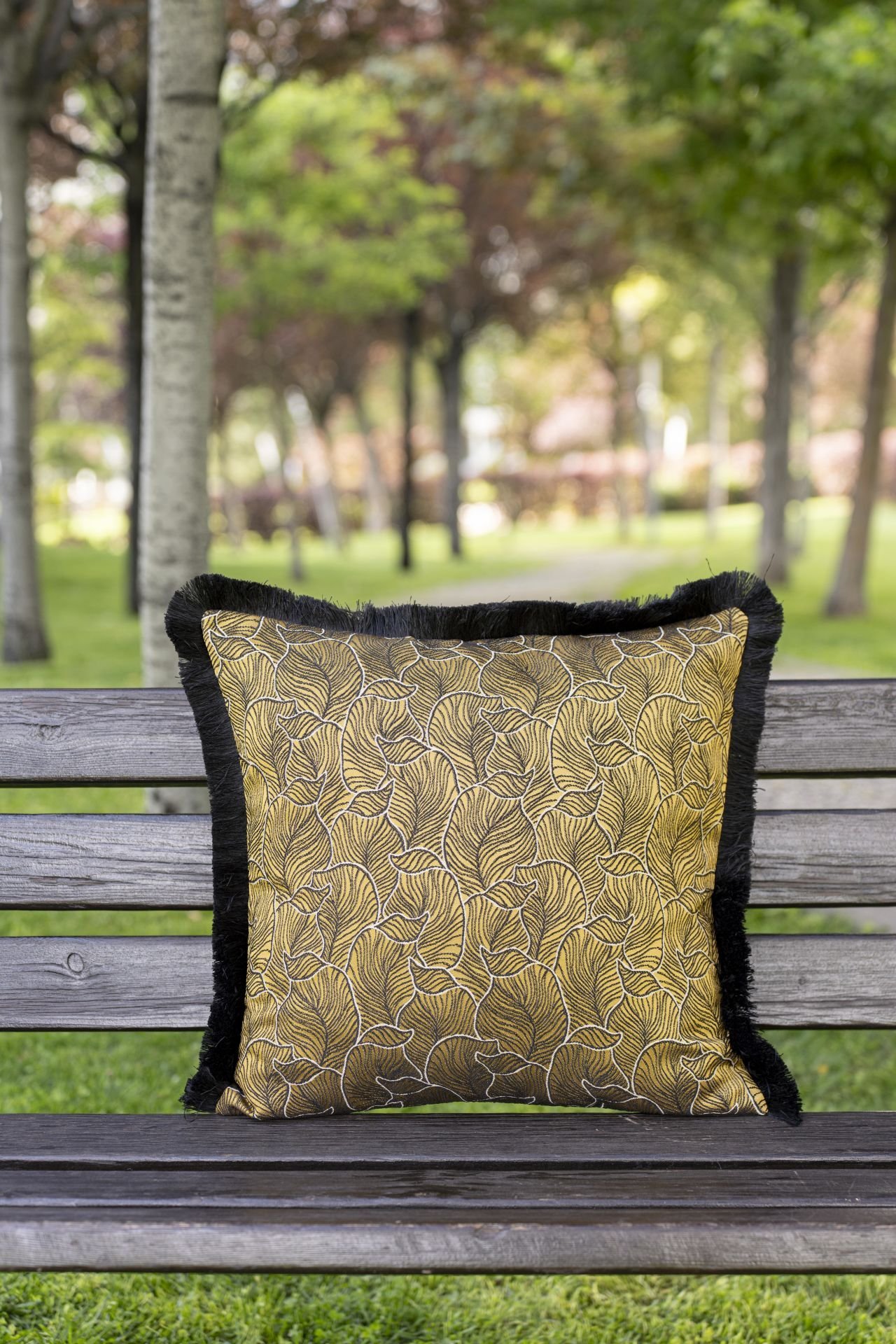Yaprak desenlerinin bir arada buluştuğu yeni sermiz YELLOW GARDEN… Ön ve arka yüzü desenli döşemelik kumaş olup, kenarları siyah saçaklıdır. Gizli fermuarlıdır. Ölçüleri: 45*45 cm'dir.